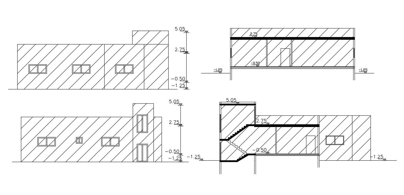 Download free DWG file of single storey house building sectional elevation design with dimension detail which shows plater wall design, door and window design.