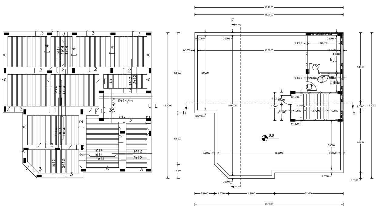 this is drawing of residence house floor with column layout plan reinforcement with hatching dimension detail, column download DWG file house construction working layout plan and RCC slab bar schedule structure detail.this is the drawing of bungalow planning bedrooms, dining area, living room, toilet, wash area, kitchen, storage area.