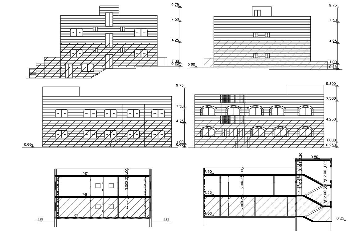 This is drawing of bungalow sectional elevation design simple house, floor levels dimension details, doors, and windows, hatching design in elevations and section, download the CAD file.