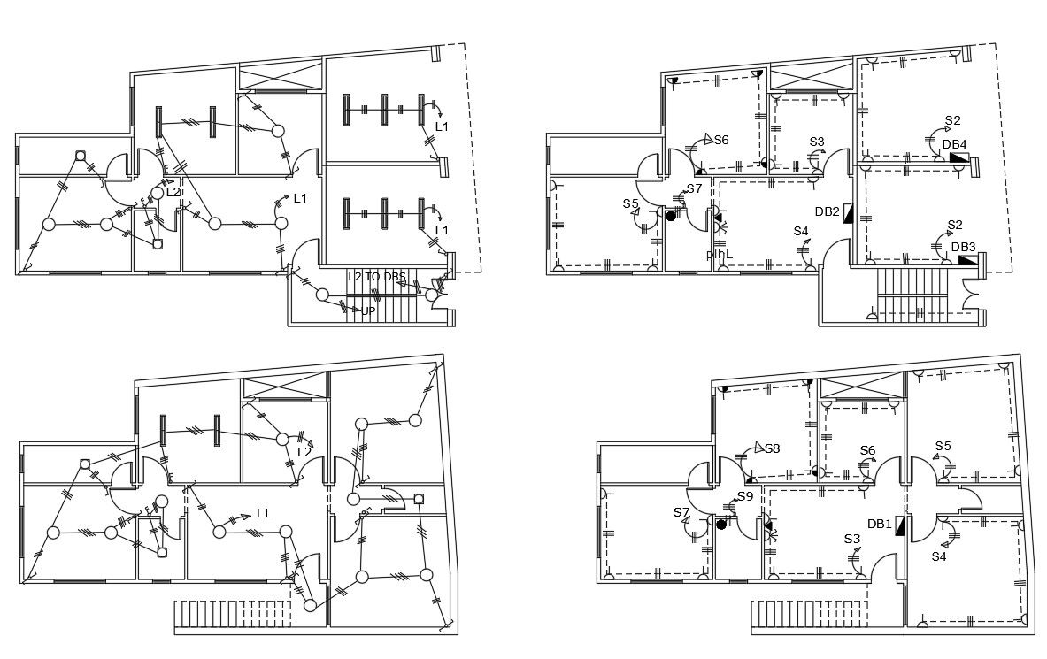 The architecture house ground floor and first-floor plan electrical layout plan CAD drawing includes false ceiling design plan and wiring plan with sitch board and light point. download DWG file of house electrical plan drawing.