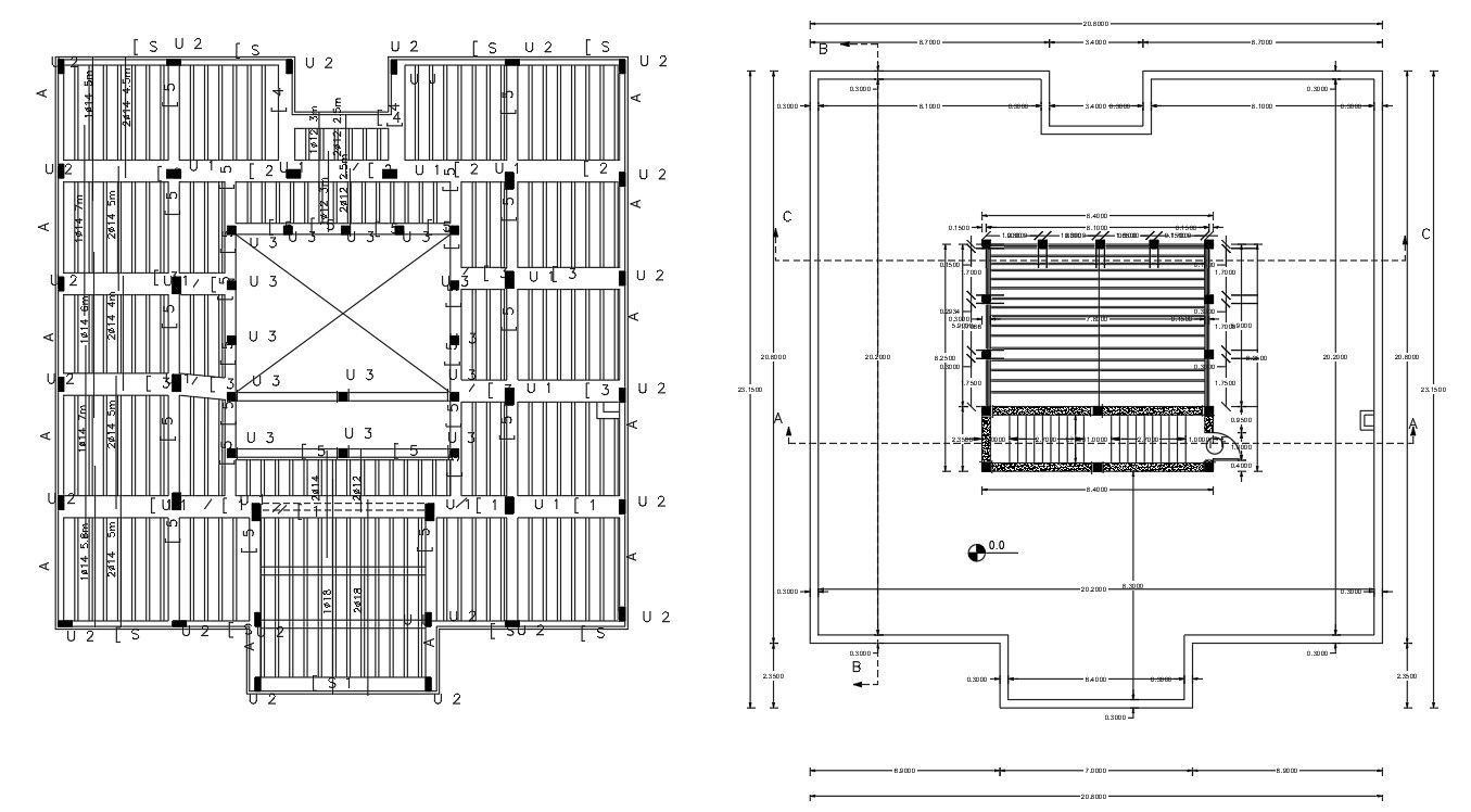 slab reinforcement bars details with calculation of that details in dia.beam and column marking in slab, terrace floor plan with cutout in middle portion. some dimension details in terrace floor and section line in the plan.