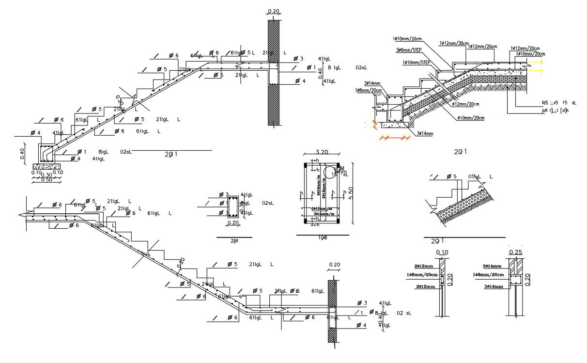 structural drawing of stair section detail with beam reinforcement, column bars details, joints details between wall and beam.its all details of stairs related download CAD File format.