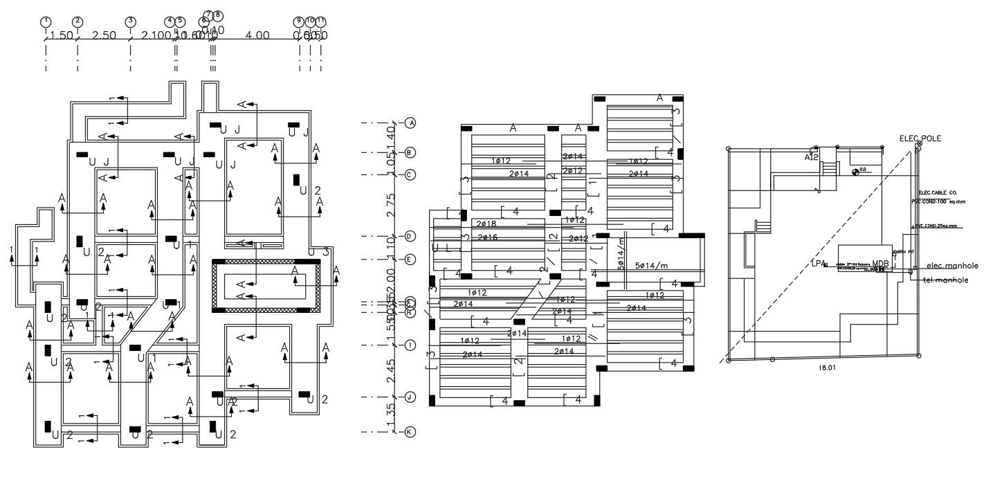 Bungalows construction house working plan CAD drawing includes column foundation layout plan design with dimension layout. also has an excavation plan, and slab reinforcement bars structure design. download the DWG file.