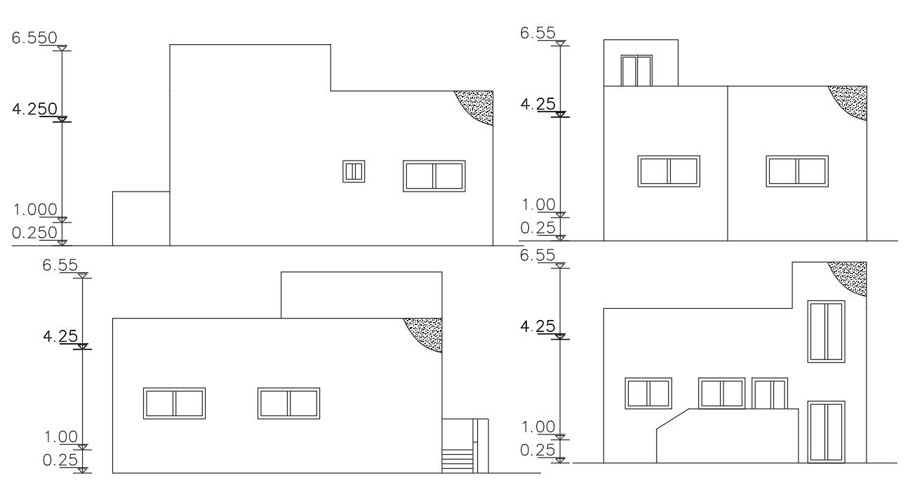 2D CAD drawing of single floor house building elevation design which are viewed from a number of different angles and also go with different outdoor designs with 21 feet height. download DWG file of house building CAD drawing.