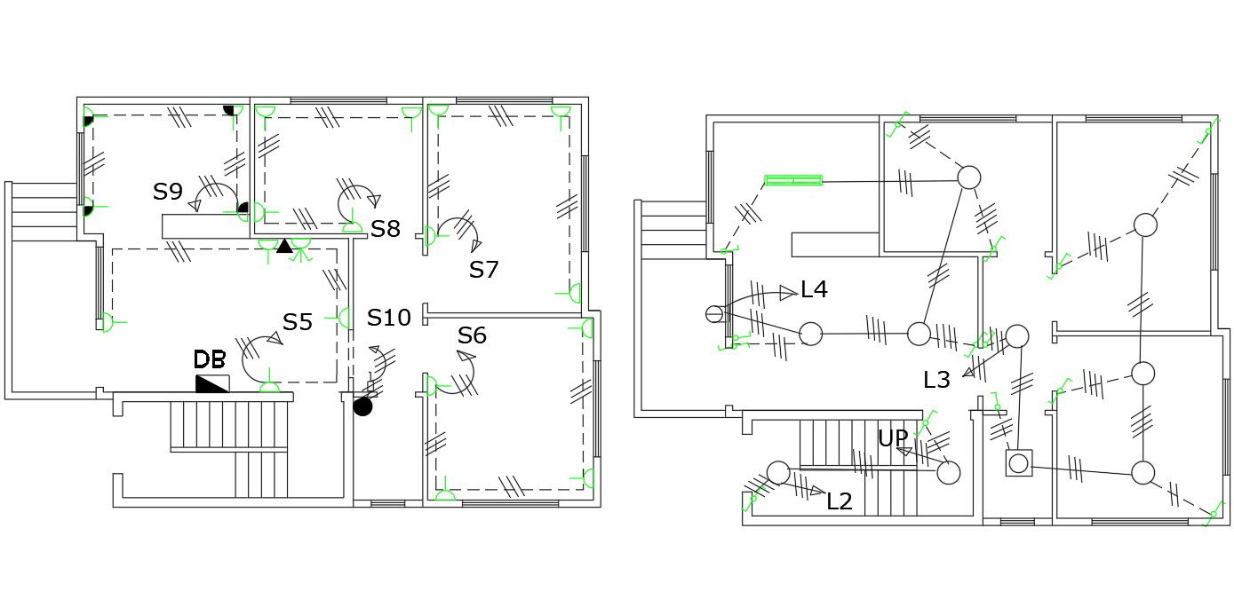 2D CAD drawing of 2 bedroom house floor plan includes electrical layout plan which shows switchboard point, ceiling fan point and wiring layout plan design. download DWG file of house electrical layout plan DWG file.
