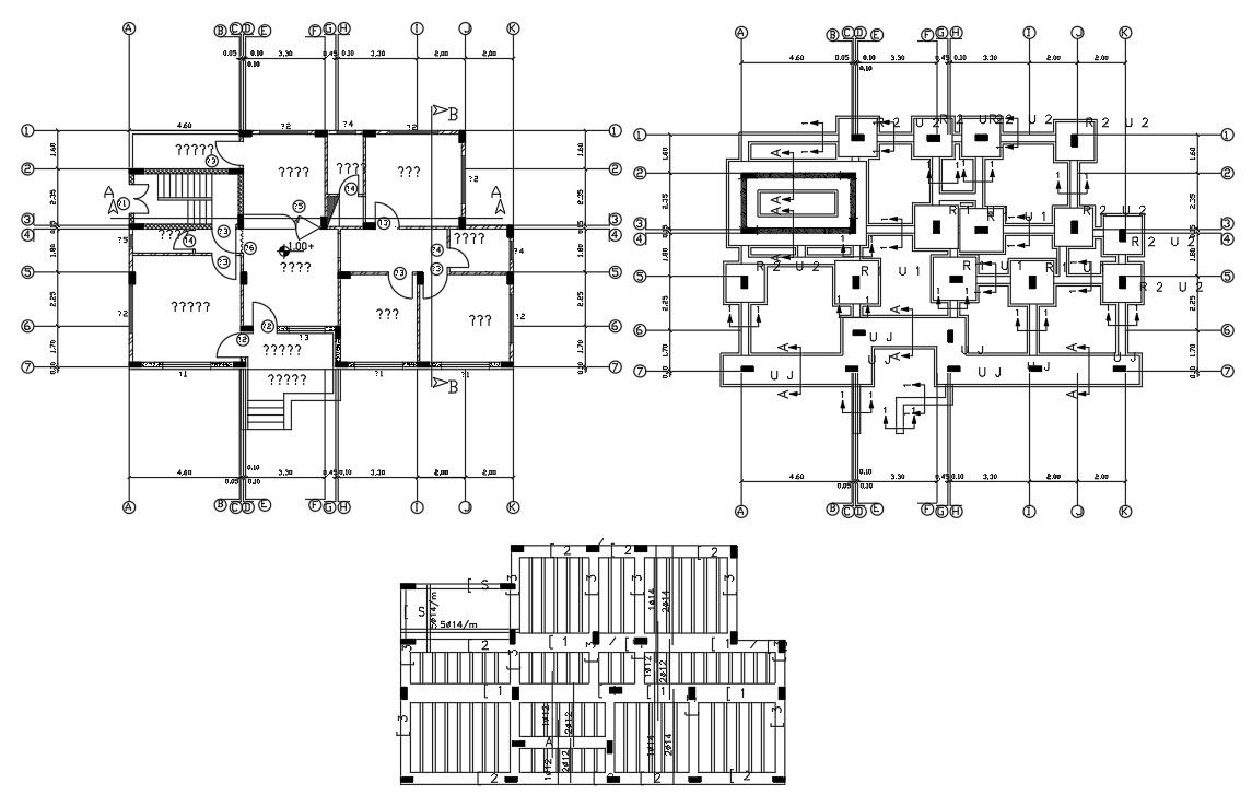 the construction working plan AutoCAD drawing includes column footing plan with excavation design and centre line detail. also has element analysis of reinforced concrete slab which is support on column and slab bar design.