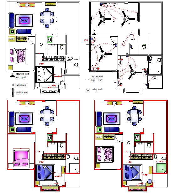 House design in Interior detail telephone point and t.v point, switch board, tubelight point, wall mounted hight--- 7'.6", celling point.