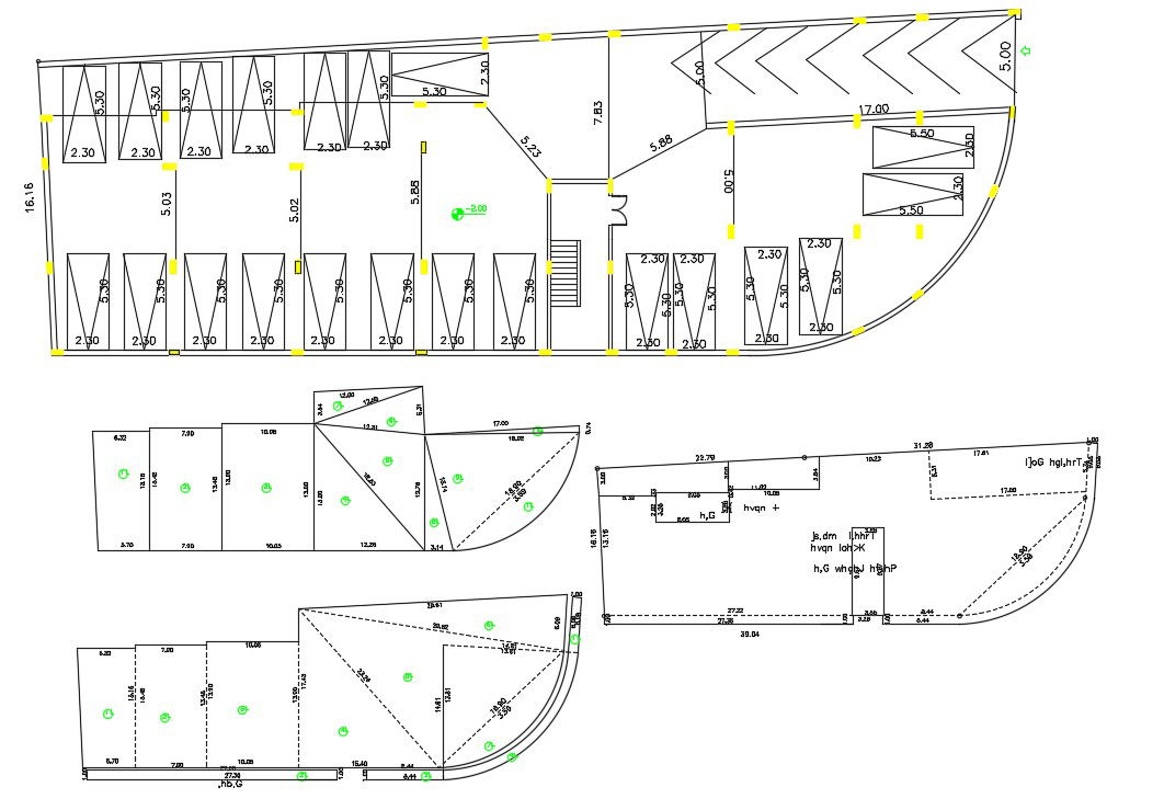 Architectural commercial building floors plan with working drawing dimension details, parking layout in the basement floor that show parking ramp design, ramp slope design, and various other units details download AutoCAD file.