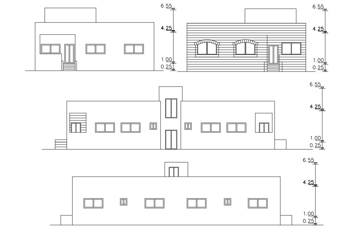 2D CAD drawing of residence house building elevation design CAD drawing shows single storey building structure design with a number of different angle elevation design and dimension detail. download free DWG file of house building CAD drawing.