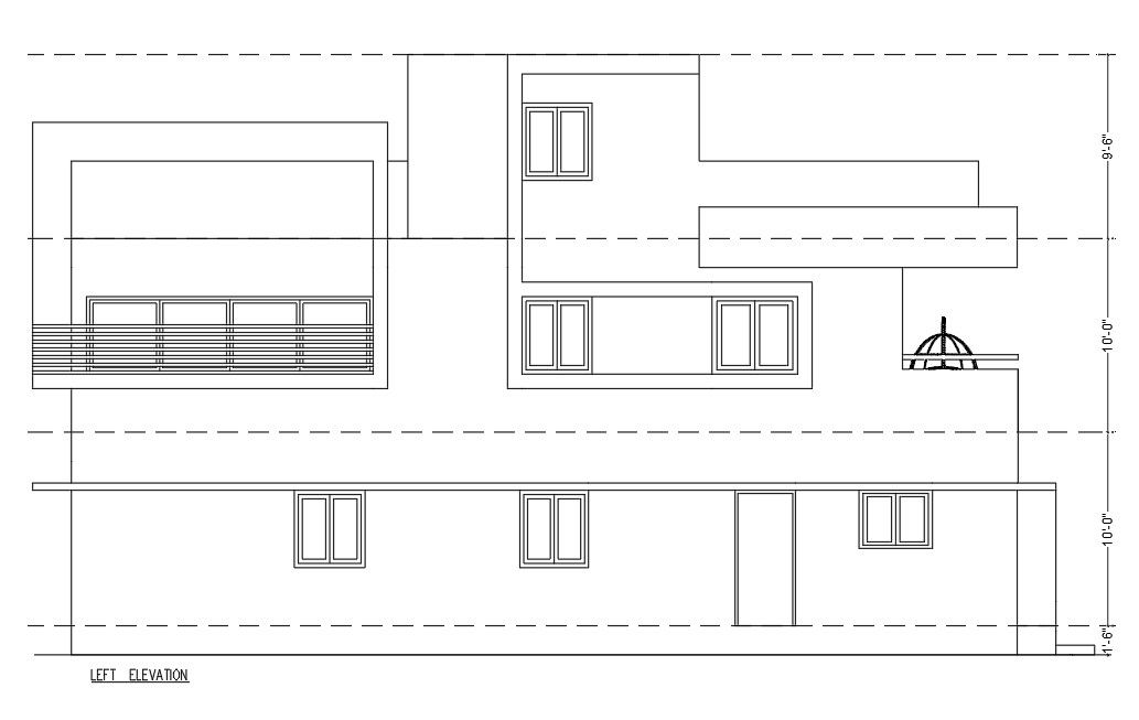 this is the drawing of the residential building left side elevation with floor levels dimension details, floor height is 10', some doors and windows marking in elevation, free download this drawing and use in a related project.