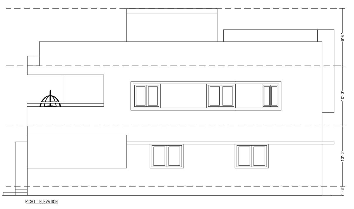 simple right side elevation design of residential house building with floor levels dimension details, windows in elevation, box window design in elevation and other more details in it.