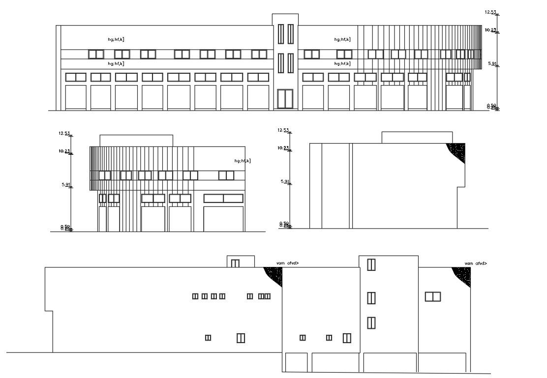 Residential house building design with floor levels dimension details, doors and windows marking in elevation, and other more detail related to elevation, it a DWG file format.