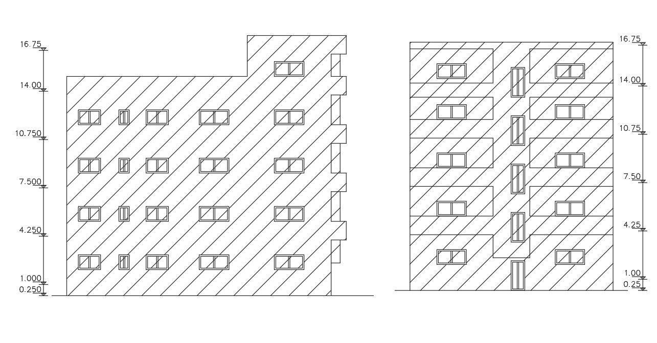 2d CAD drawing of apartment building side and front elevation design with dimension detail and window set up design. download free DWG file of apartment CAD drawing.