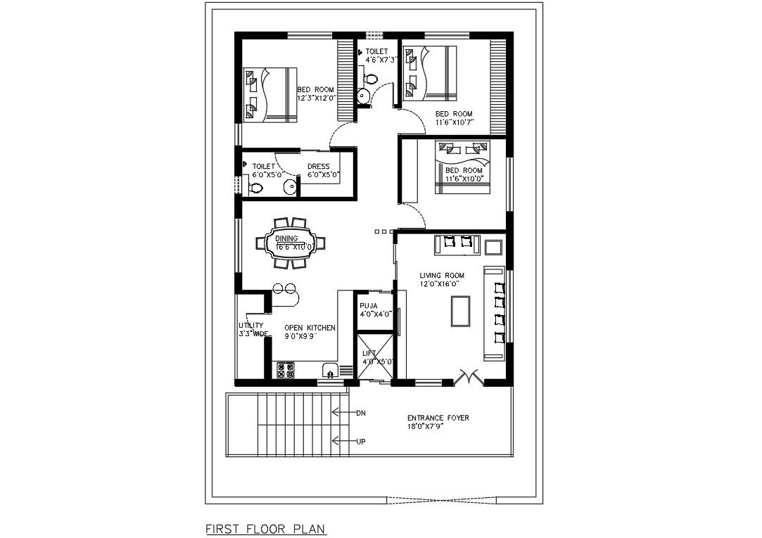 First Floor Plan Of Bungalow With Furniture Layout DWG