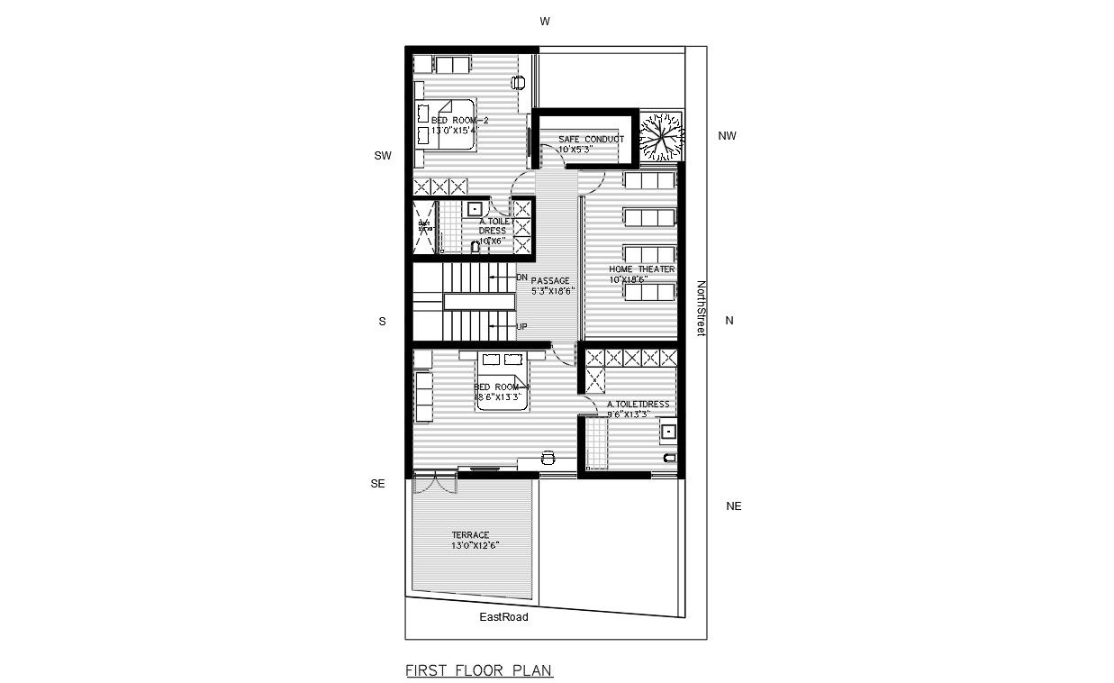 as per vastu bungalow planning design of first floor with furniture layout plan.in this drawing added two bedrooms with toilets and dress area, safe-conduct, theatre, passage and this is the good presentable bungalow design.