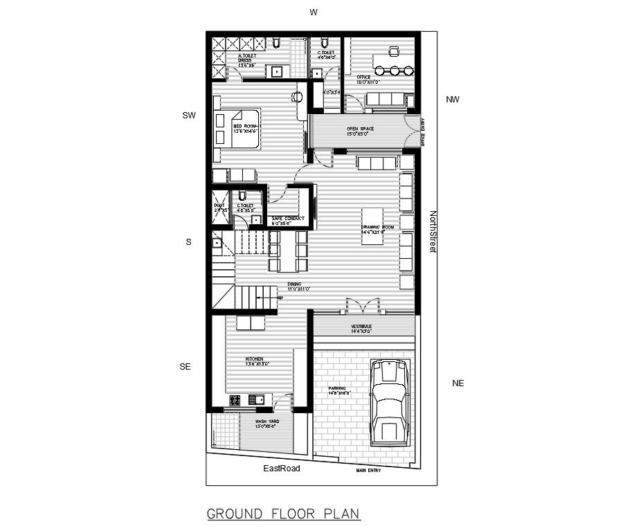 this is the planning of huge architectural bungalow design with fully furnished layout, some hatching design in it.in this drawing added car parking, vestibule, drawing room, kitchen, bedroom, dining area, stair wash yard and backside office design. ground floor plan of the house.