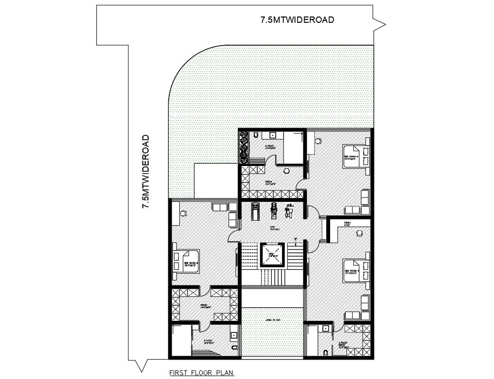 download this drawing which is related to the first floor of a residential bungalow modern architectural design.in this planning added three bedrooms with attached toilets and dress, gymnasium and stair-lift with foyer.this is the fully furnished house design.