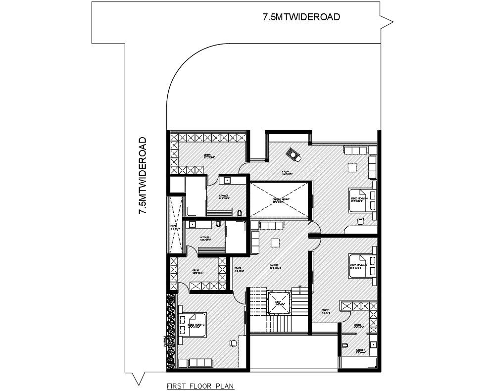 modern residential bungalow planning with fully furnished layout design, in this drawing, added three bedrooms with attached toilet and dress, lounge, stair and lift with foyer and much more other functions related to good house.