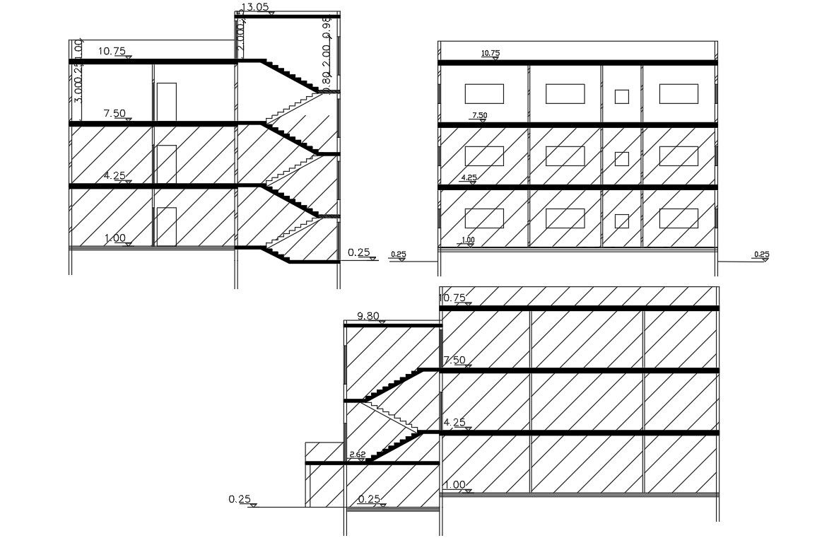 Architecture House Building design CAD drawing includes 3 storey building drawing with dimension detail. this drawing includes RCC standard staircase and slab design. download DWG file of house building section drawing.