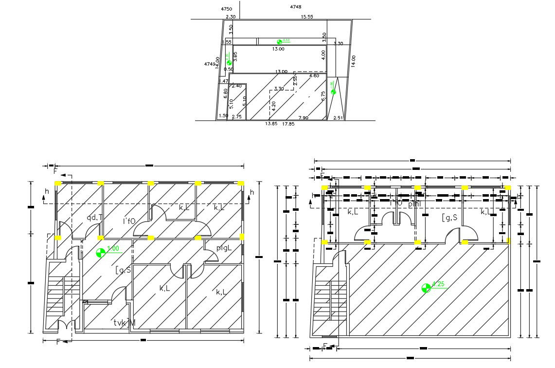 the ground floor and first-floor plan of house project AutoCAD drawing includes 6 bedrooms, kitchen, drawing room, living room, staircase and open terrace area. also has a column layout plan and site plot with area survey dimension detail.