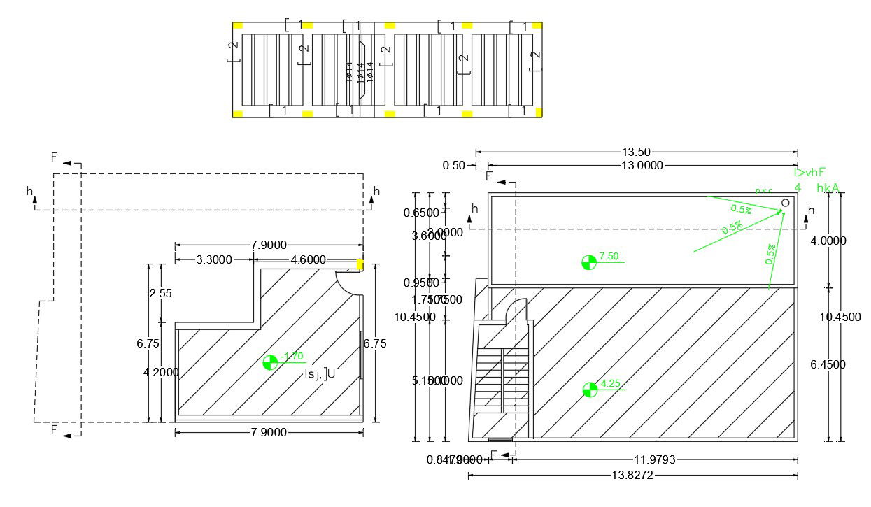 Free download house ground floor plan and first-floor plan CAD drawing includes dimension detail, column plan, and slab bars structure design.