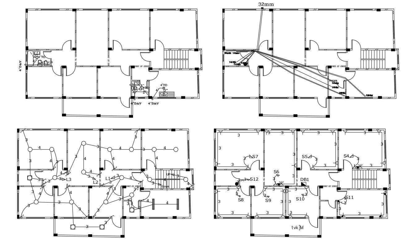 2d AutoCAD drawing plumbing layout plan 32 mm pipe and electrical layout plan include ceiling point, plug point, and switchboard. download the AutoCAD file.