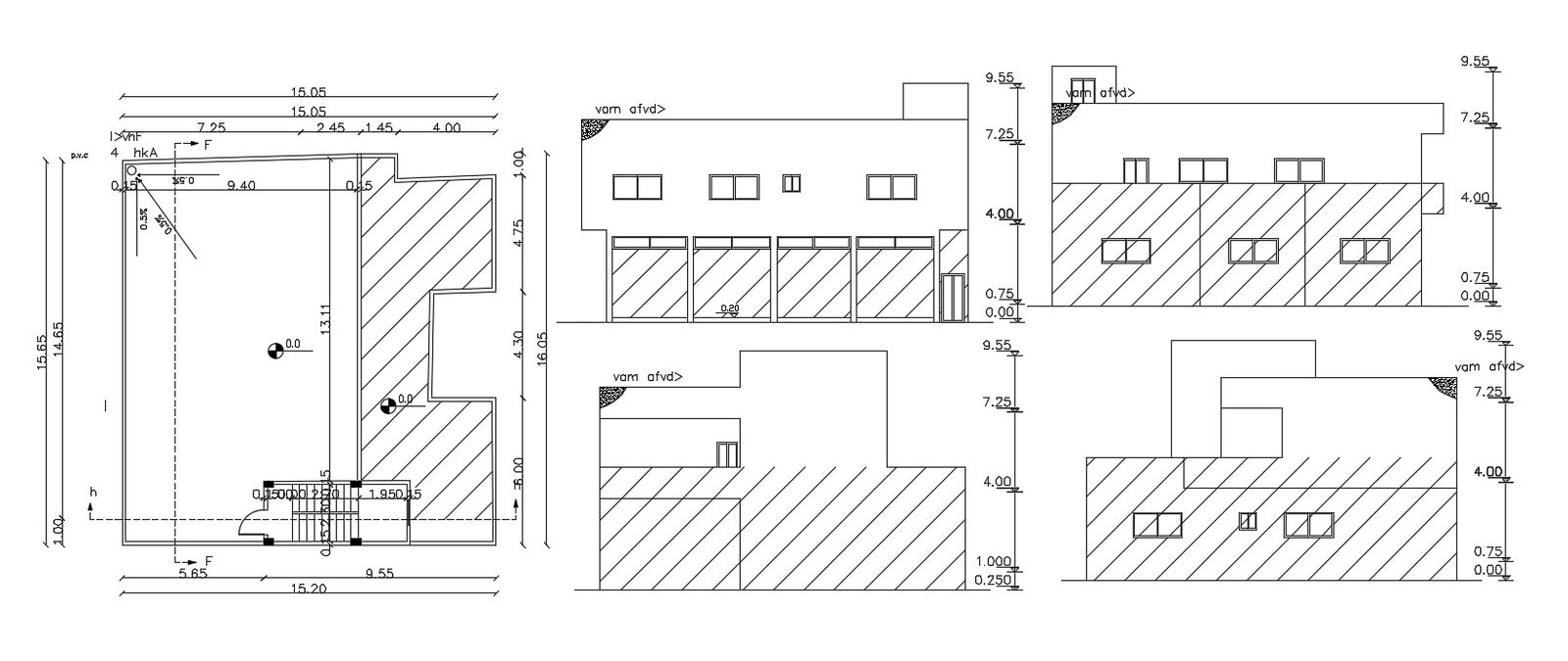 Download the CAD file. this is elevation include plinth level, floor level, door, and window details and dimension details also have elevation hight9.55 meter.