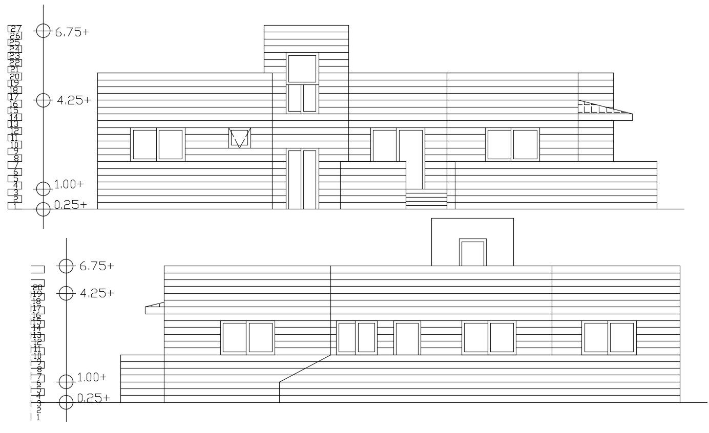 Residential elevations include a height 6.75 meter, windows and door details, floor level, plinth level with dimension details and hatching. download the DWG file.