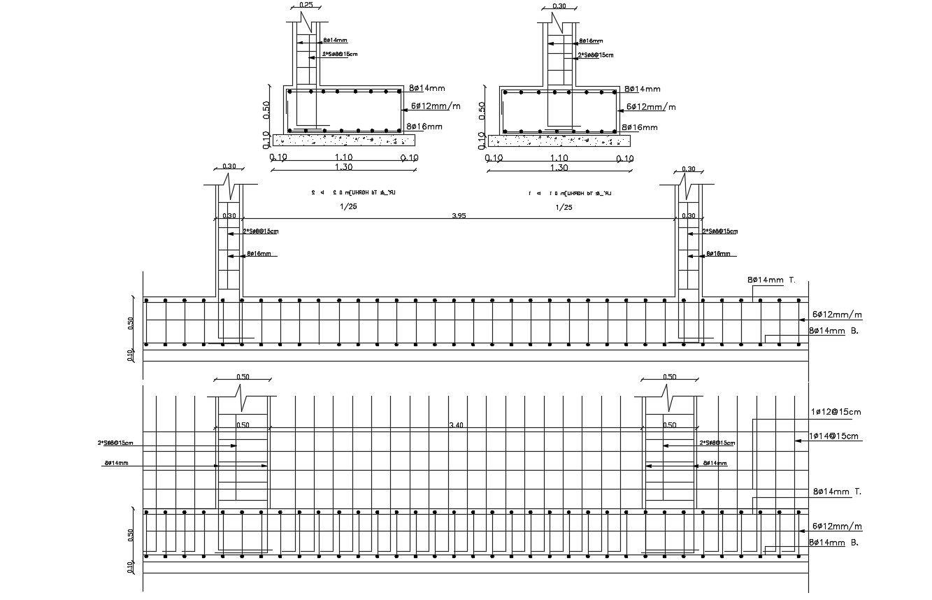 This drawing provides longitudinal reinforcement, transverse reinforcements, stirrup spacing, and more dimension details. download the CAD file.