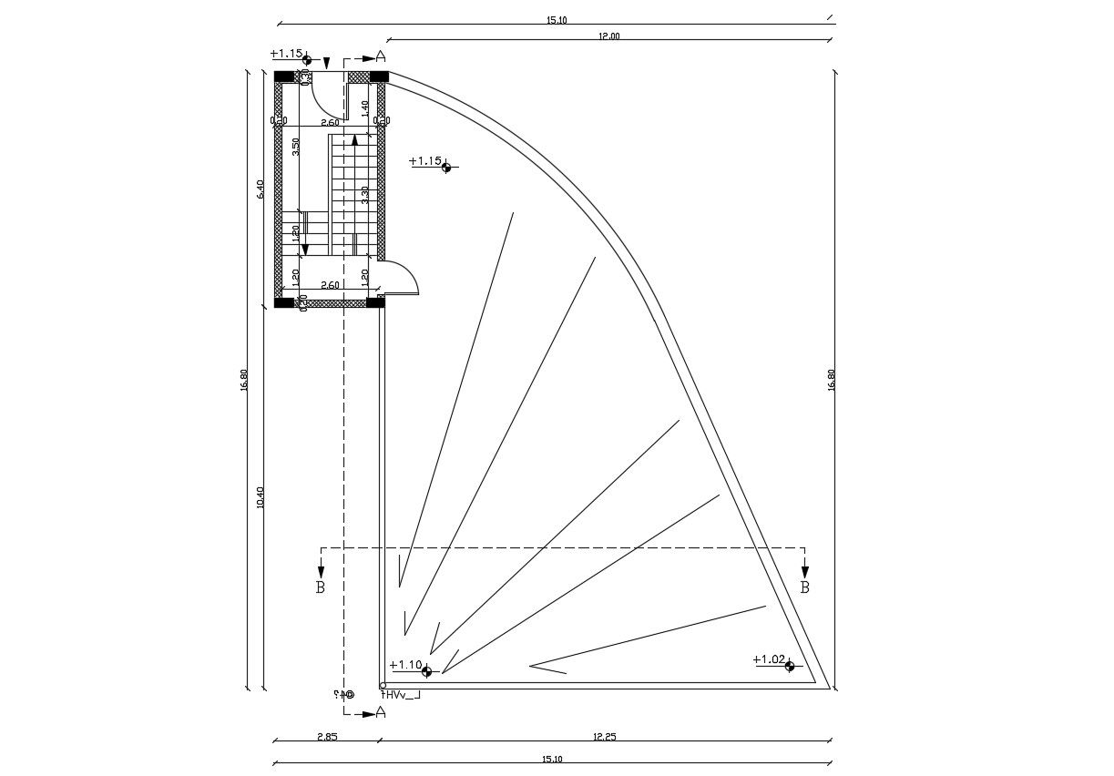 2d drawing residential house terrace floor size 15.10 X 16.80 meter and dimension details. download the DWG file of terrace floor plan drawing.