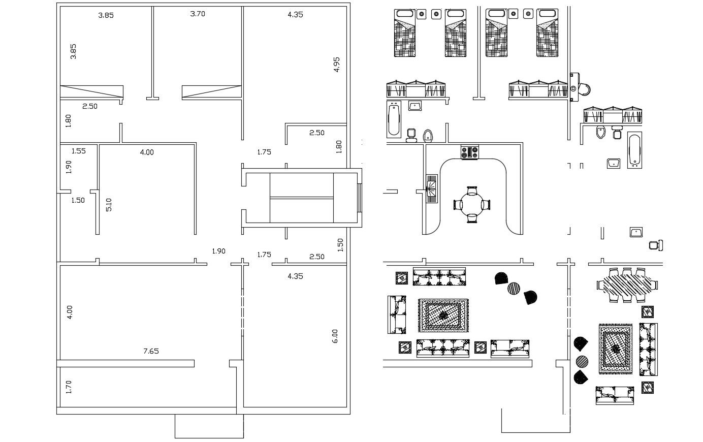Bungalow furniture layout plan includes living area, kitchen, washroom, toilets, garden, staircase, drawing room, and 3 bedrooms. it a DWG file AutoCAD format.