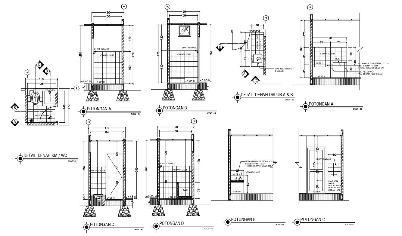 toilets details with plan internal four side elevations, working dimension details, tiles marking in sections, sanitary layout detail, sunk marking in sections, it's a good section details of toilet.