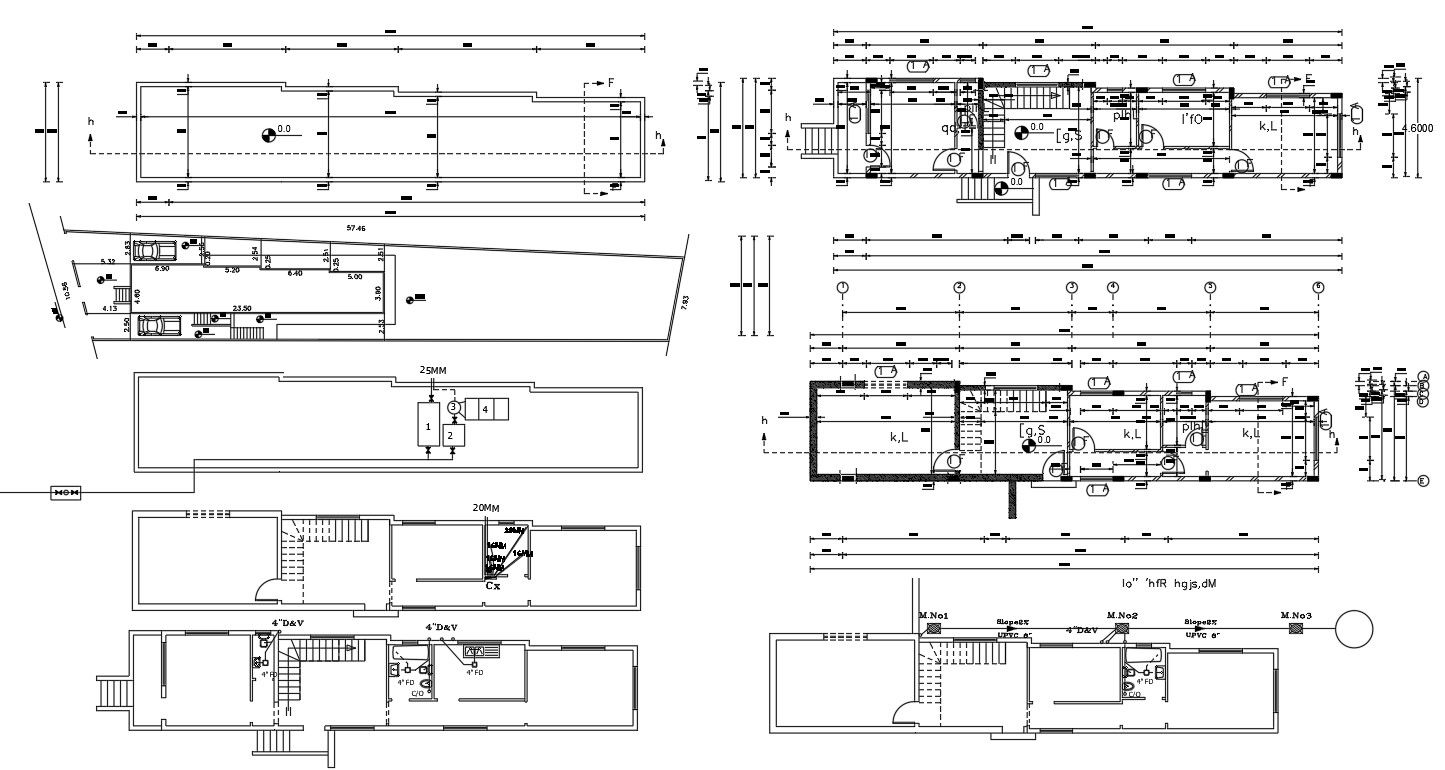 4 bedroom house ground floor plan and first-floor plan raw house types design with dimension detail and plumbing layout plan. Download DWG file of 4 BHK house plan with parking detail.
