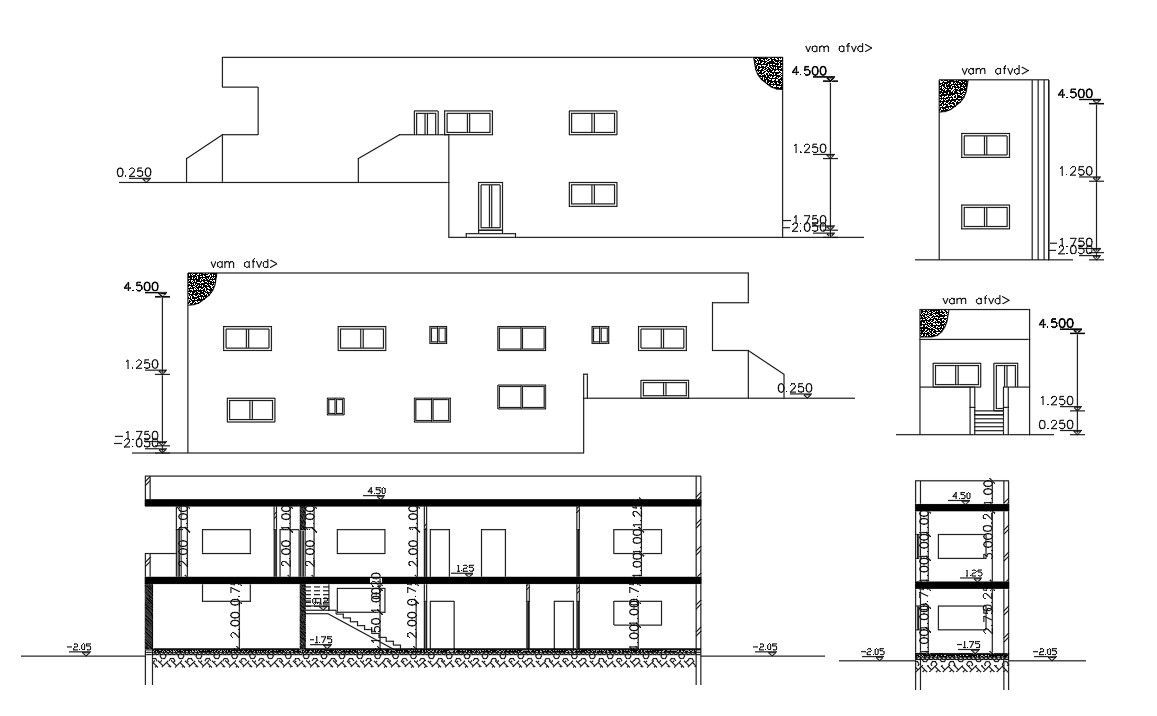 This is 4 bedroom house building sectional elevation designs which are the view from a number of different angles with dimension detail. Download raw house building design DWG file.