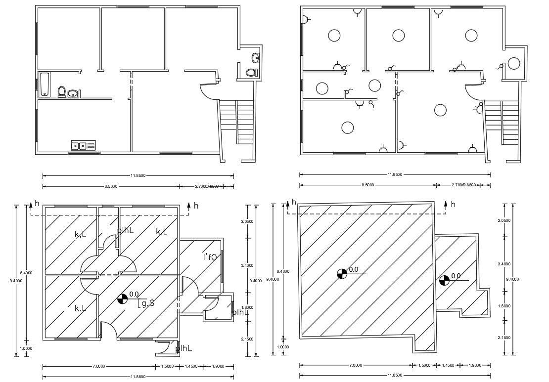 1050 SQ FT house floor plan CAD drawing includes 2 bedroom house ground floor and terrace plan design with dimension detail. Download DWG file of house AutoCAD hatching design with electrical layout plan.