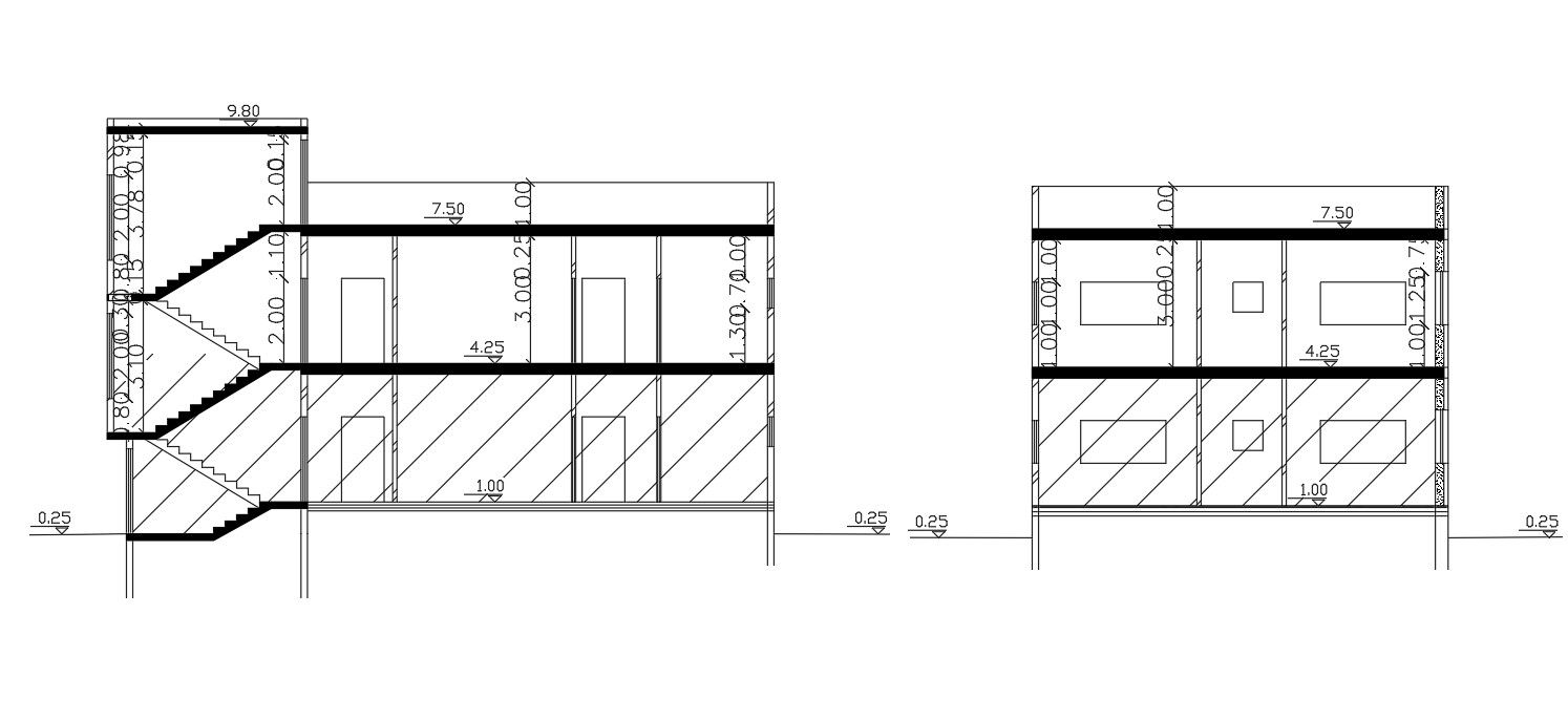 2d CAD drawing of house building section drawing shows floor level 2 storey building design, RCC standard staircase and slab design with all dimension detail.
