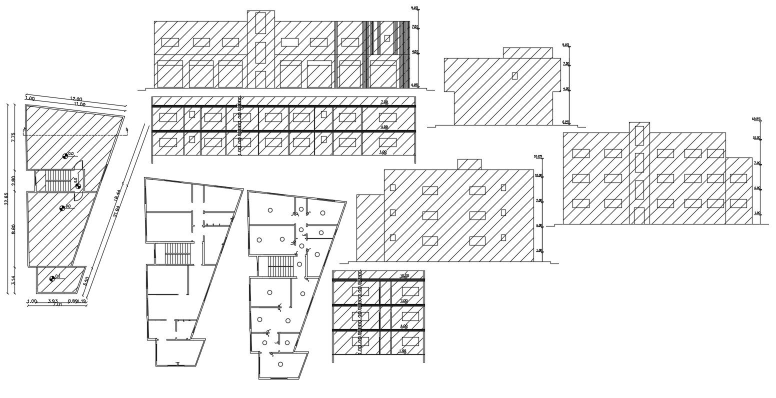 2d drawing electrical layout includes plug points, switchboards, and fan points. elevation layout with floor level, plinth level, door and windows, hight is 12.25 meter. download drawing AutoCAD format.