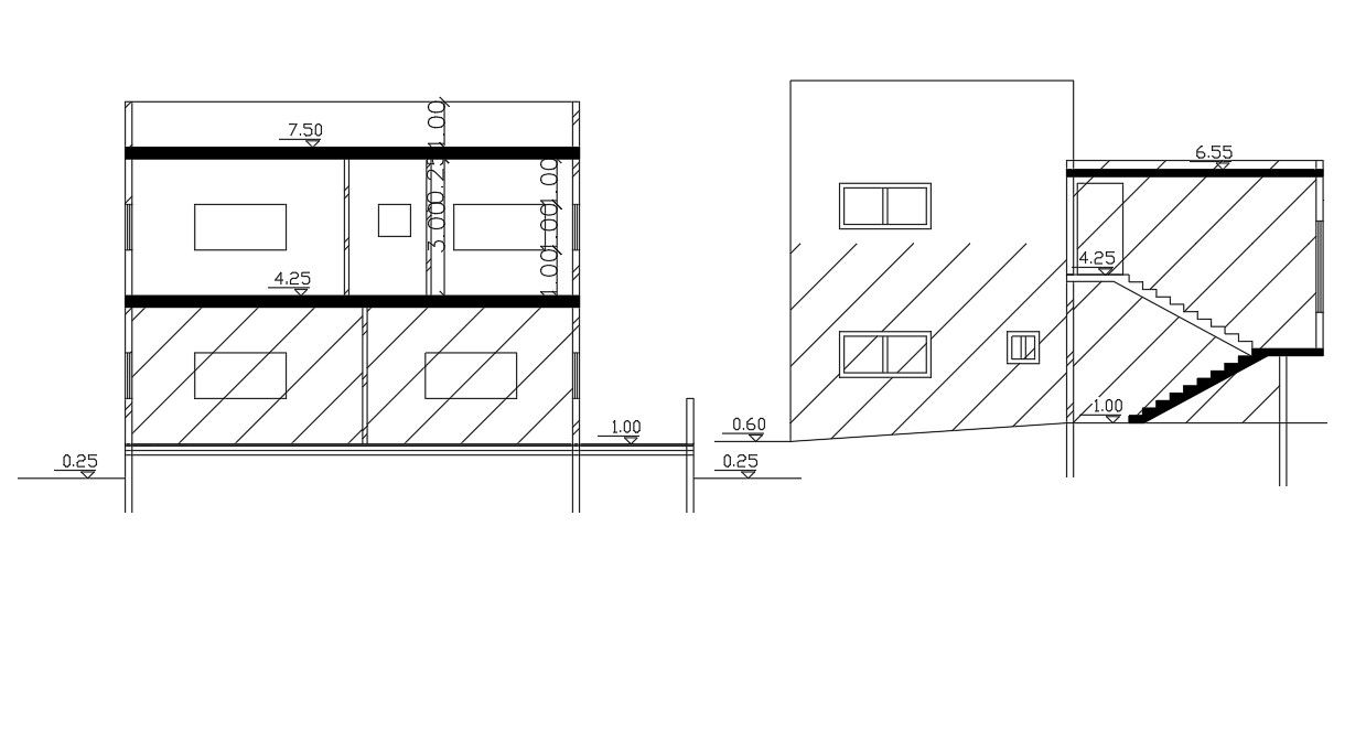 AutoCAD house building section drawing includes RCC floor slab and standard staircase design with dimension detail. download free DWG file of house section CAD drawing.