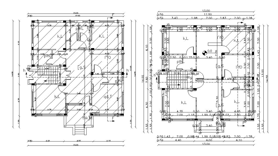 two floors plan of residential huge bungalow planning with working drawing dimension details, structural column layout marking in the plan, doors and windows marking in the plan.it's a good house architectural planning.