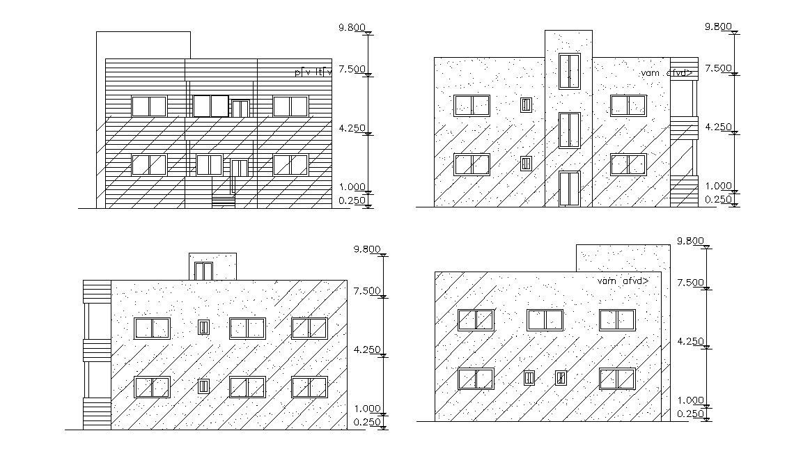 this is the residential four side simple elevations includes floor levels dimension details, doors and windows marking in elevations, hatching design in elevations and this is the simple architectural elevations.