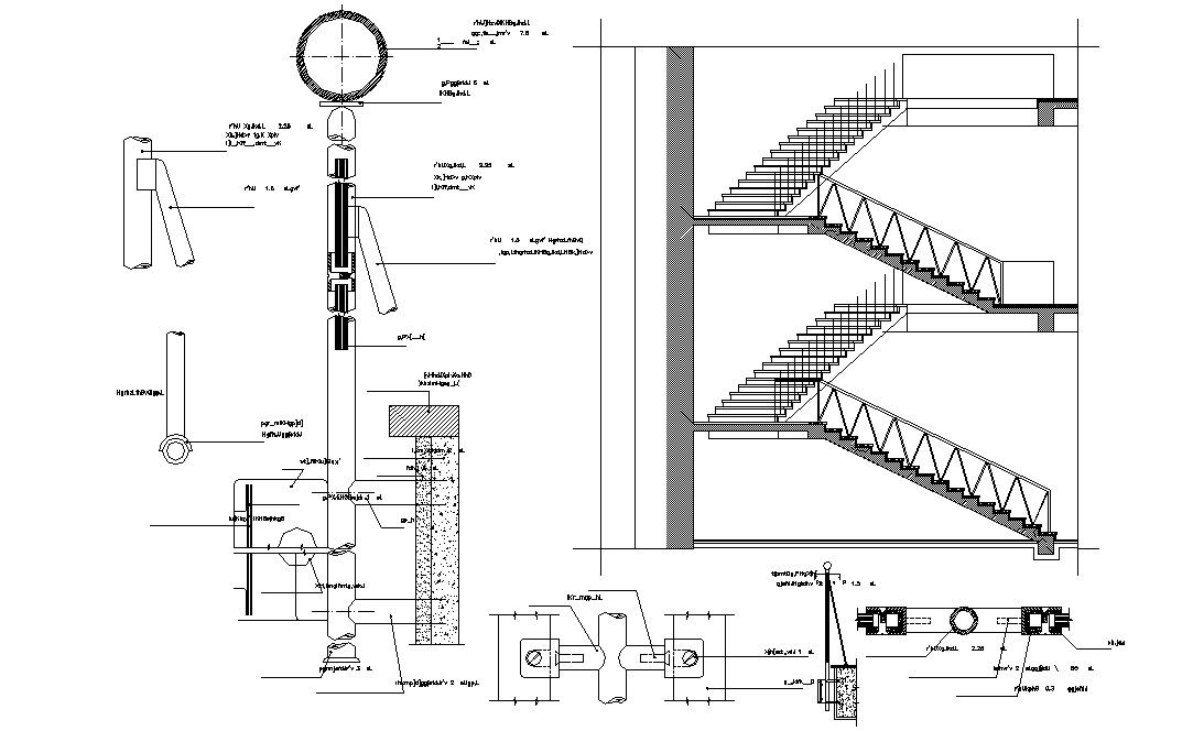 this is the drawing of the structural stair section with railing, floor surface details, how to fix railing in the balcony, some texting details, percolating well details and other more details in this drawing.