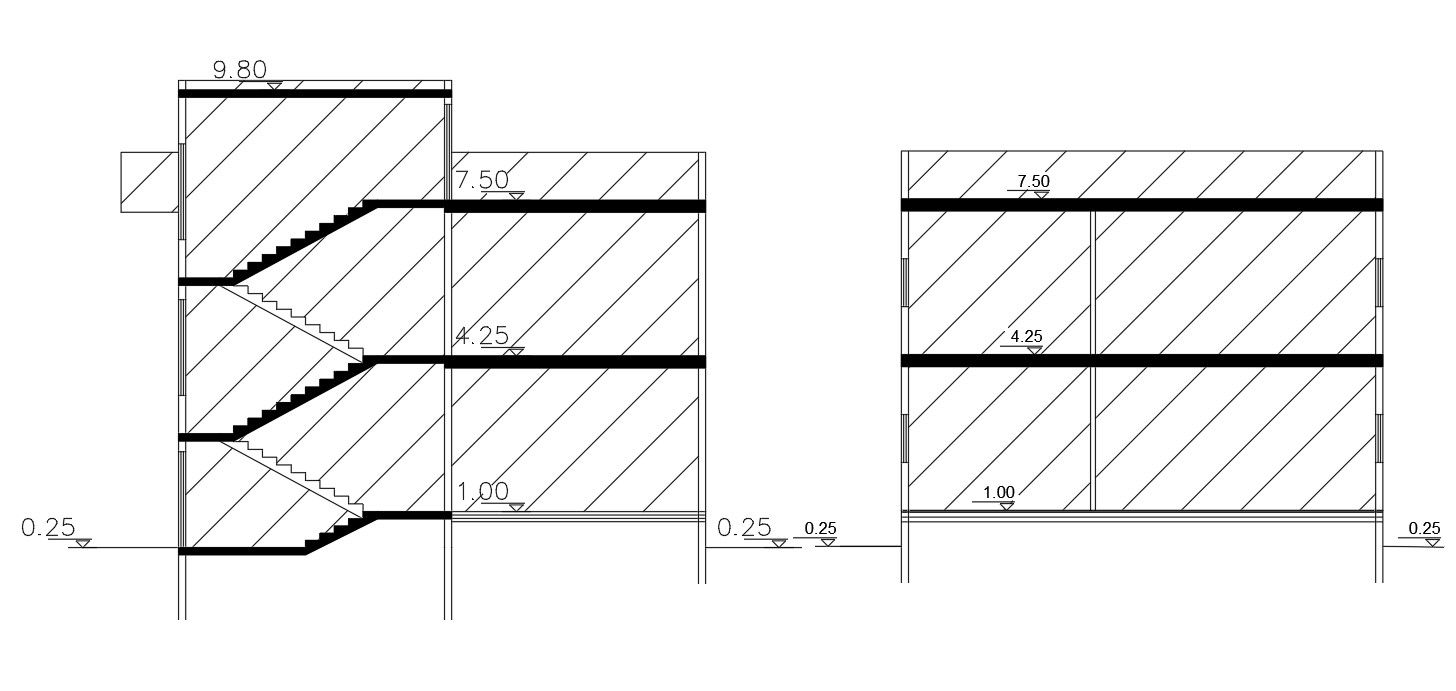 Architecture house building section drawing includes RCC standard staircase design and floor slab with dimension detail. download free DWG file of house building section drawing.
