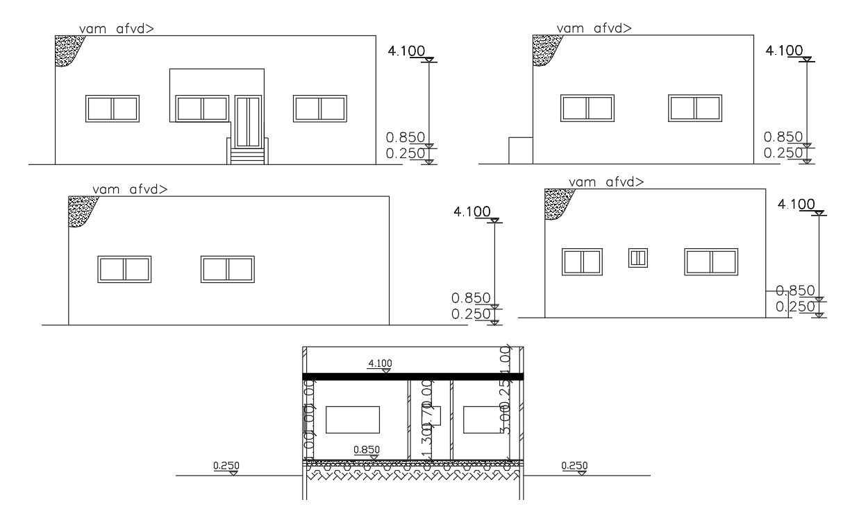2D CAD drawing of one storey house building sectional and elevation design with dimension detail and this free design for CAD presentation.