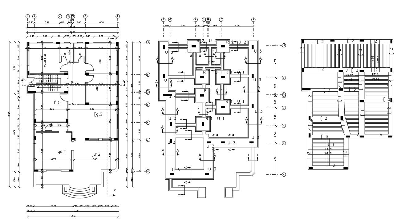 2400 SQFT plot size for 3 bedroom house ground floor plan AutoCAD drawing includes column footing and slab bars reinforcement bending structure design with all dimension detail. download DWG file of construction working house plan design.