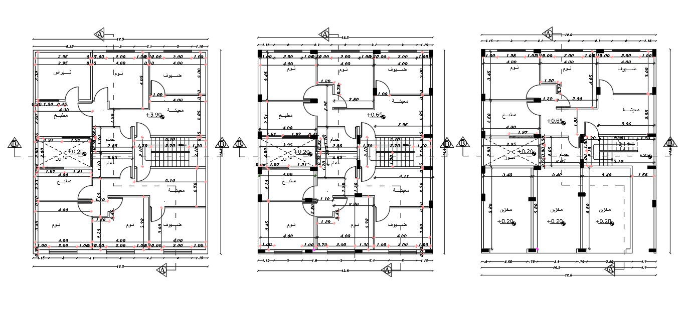 Architecture apartment cluster floor plan design includes 2 unit house plan and column layout plan design with all dimension detail. download DWG file of 2 BHK apartment house plan design.