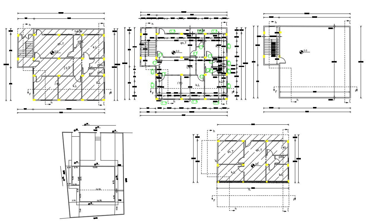 The construction working house floor plan AutoCAD drawing includes column layout plan and final plot plan with demarcation and all dimension detail. download DWG file of 3 BHK house construction plan drawing.