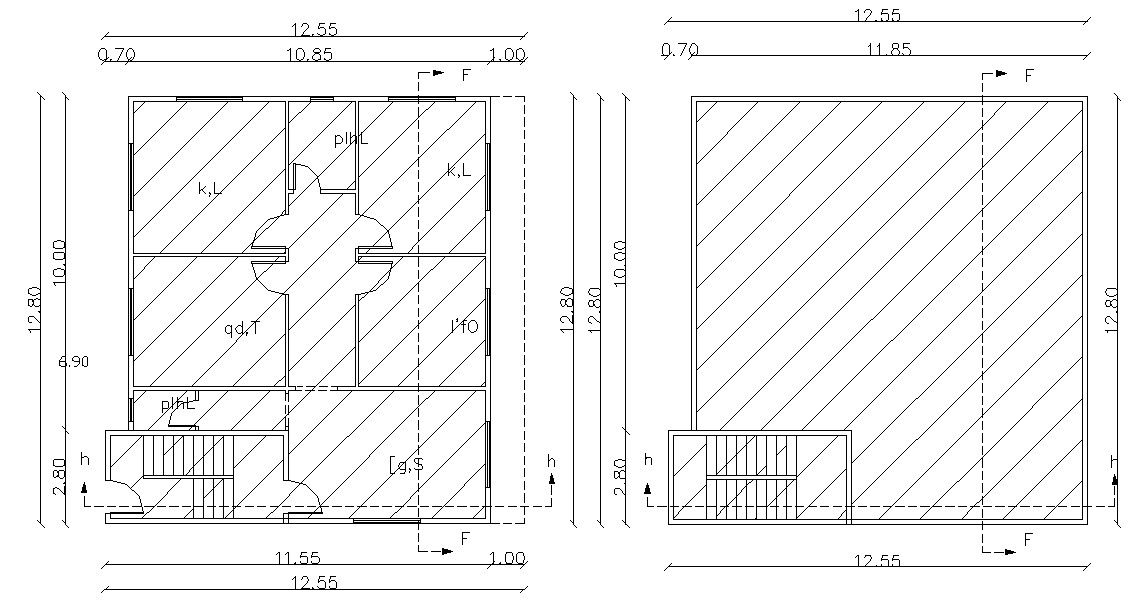 two-floor plan of architectural residential building design with working drawing dimension details, some hatching design in plan, terrace floor plan with stair cabin, in this planing added drawing room, bedrooms, kitchen, toilet stair with foyer.