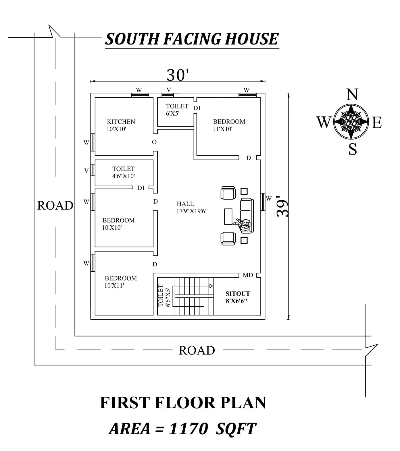 Autocad Drawing file shows Amazing 30'x39' 3bhk South facing House Plan As Per Vastu Shastra. The total buildup area of this house is 1170 sqft. The kitchen is in the Northwest direction. The Hall Placed in the southeast direction. The master bedroom is available in the southwest direction. The guest bedroom is in the Northeast direction with the attached toilet in the north direction. kid's Bedroom placed in the west direction with the attached toilet is in the west direction. A staircase is available in the south outside of the house. The common toilet is available in the south direction under the staircase. sit out is available in the Southeast direction of the house. Road Available in the South and west direction.Download Autocad Drawing file and PDF file.