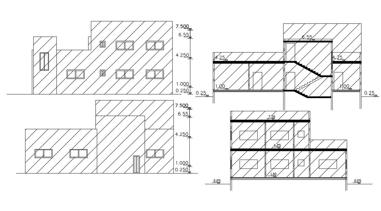 2d CAD drawing of residence house building sectional and elevation design which is number of different angle view design with dimension detail. download DWG file of house building CAD drawing DWG file.