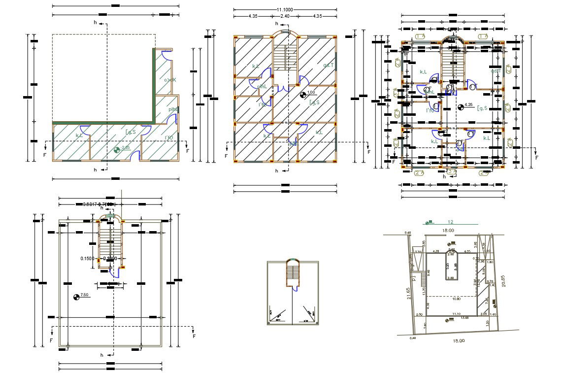 2d CAd drawing of 4 BHK house floor plan design includes a column layout plan, plot site 2100 SQ FT size plan with the ground floor has a parking space to accommodate 2 big cars. download DWG file of the house floor plan and terrace plan with all dimension detail.